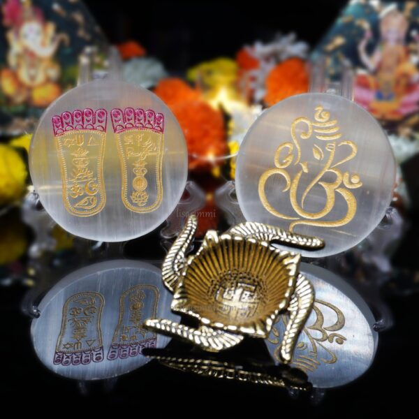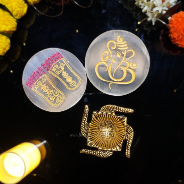 This Kit includes Selenite Lakshmi Feet & Lord Ganesha Plate with Sacred Diya